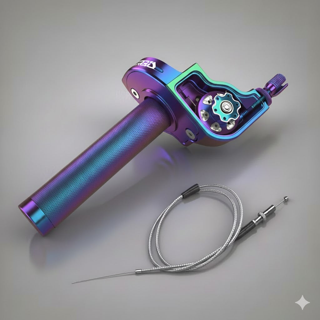El acelerador de cuarta Acerbis está diseñado para optimizar la apertura del carburador, permitiendo alcanzar el máximo de gas en solo un cuarto de vuelta. Esto mejora la reacción del motor, brinda un control más preciso y reduce el esfuerzo del piloto al acelerar.